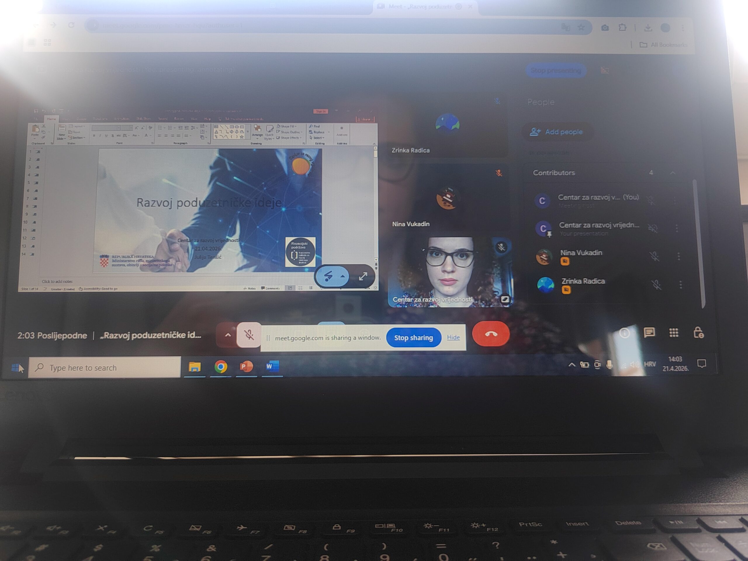 Dana 21. travnja 2026. godine, s početkom u 14:00 sati, putem platforme Google Meet održana je radionica „Razvoj poduzetničkog potencijala“ . Radionica je okupila motivirane sudionike željnog razvijanja vlastitih ideja i osnaživanja svojih vještina u poduzetničkom smislu. Na radionici je sudjelovalo 8 sudionika, 3 aktivna i 5 pasivnih.