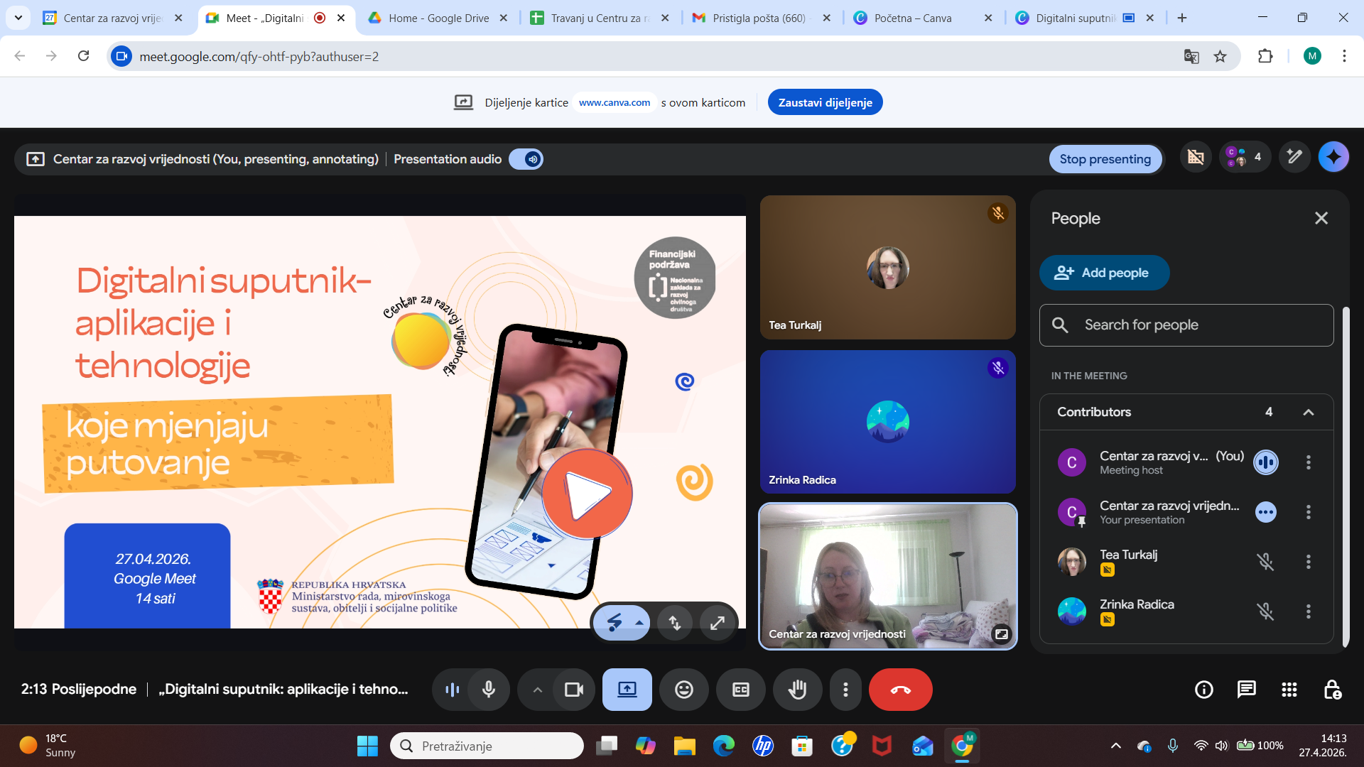 Dana 27. travnja 2026. godine u sklopu trogodišnjeg programa projekta “Zajednica mogućnosti-servisi podrške za kvalitetniji život osoba s invaliditetom u lokalnoj zajednici” održana je online radionica pod nazivom „Digitalni suputnik – aplikacije i tehnologije koje mijenjaju putovanje“ putem platforme Google Meet. Radionicu je organizirao Centar za razvoj vrijednosti, a bila je usmjerena na prikaz suvremenih digitalnih alata koji olakšavaju planiranje i realizaciju putovanja.