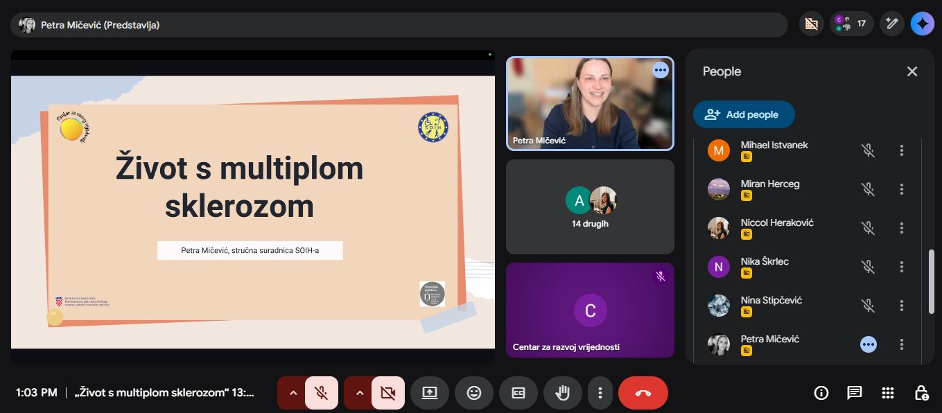 Centar za razvoj vrijednosti organizirao je online predavanje/radionicu pod nazivom „Život s multiplom sklerozom”, namijenjeno osobama s invaliditetom, članovima njihovih obitelji, ali i svima koji žele bolje razumjeti izazove života s ovom bolešću. Predavanje je bilo namijenjeno za ukupno 28 sudionika, aktivnih 17 i pasivnih 11.
